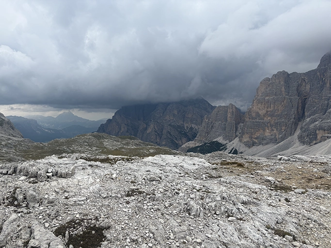 One of the challenges of walking in the mountains is the weather. Alpine mountains are prone to afternoon thunderstorms in the summer and every hikers goal is to reach the destination before the storm hits. As we looked up to Lagazuoi, we could see the clouds swirling around the top, which was at an elevation of 2750m. I wanted to get there before the elements took over. After an exhausting ascent, we thought we were at the top, only to be confronted with a series of switchbacks! Like a mirage, you keep thinking you are there but it just keeps going and going. We did manage to take in more views along the way.