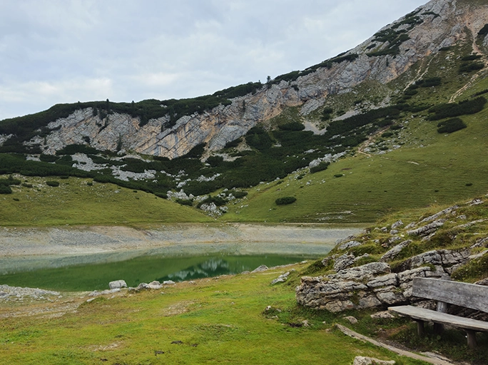 As we walked down, we could see our goal for the day, Rifugio Lagazuoi, at the top of a long steep pathway up the next mountain. At the bottom we stopped to eat our packed lunch by the lake. We took our boots off and cooled our feet in the lake.