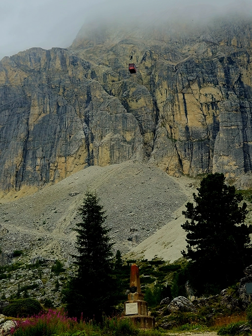 There are 3 ways to get down the mountain from Lagazuoi: a steep walk, a near-vertical pitch dark WW1 tunnel requiring via ferrata equipment, or, a nice easy cable car. I wasn’t into via ferrata, the miserable weather didn’t make the walk appealing and besides… the cable car had kind of always been my plan. It opened at 9.30am so we sheltered in the rifugio then headed on down in the cable car with the other hikers who were also sensible decision-makers.