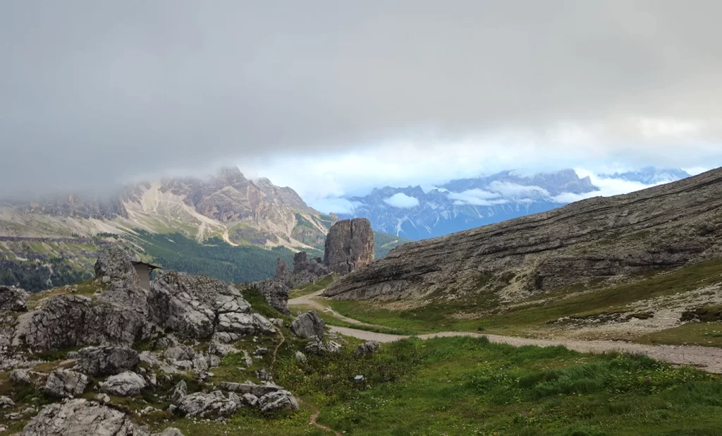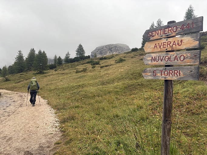 The poor weather continued so we wore our rain gear and set out for Rifugio Averau. The distance wasn’t far, and the plan for the day was to take a detour via Cinque Torri (Five Towers). A couple of kilometres in, we met 3 lovely sisters from Belgium. They said there was a thunderstorm warning for the early afternoon, so we decided not take the detour past Cinque Torri and headed straight for Averau.