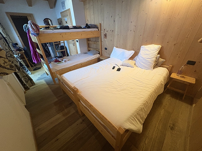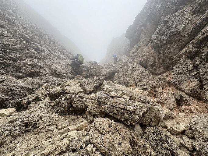 After the Forcella, we found ourselves working our way along (yet another) mountainside traverse with a narrow path and a steep drop away to one side when a thick fog rolled in. With low visibility, if you lost your footing no one would know you’d fallen into the misty abyss. Not gonna lie, I was a bit stressed and Steve kept disappearing into the mist in front of me. The rain had just started to pelt down when Averau came into view, and I was relieved to reach the warm comfort of this cosy rifugio.