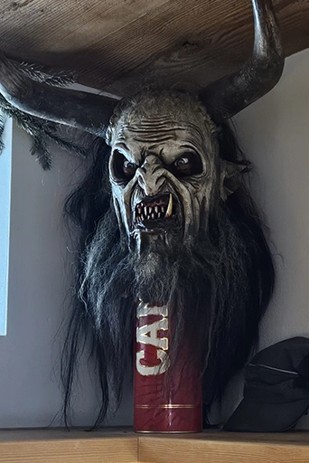 We reached our destination about 11.30am, ate lunch and hunkered down for the afternoon reading and relaxing in our comfortable room while the nasty weather did its thing outside. Rifugio Averau makes great coffee! Our new friends Tanji and Kent joined us again for dinner, which was overseen by the Christmas demon Krampus.