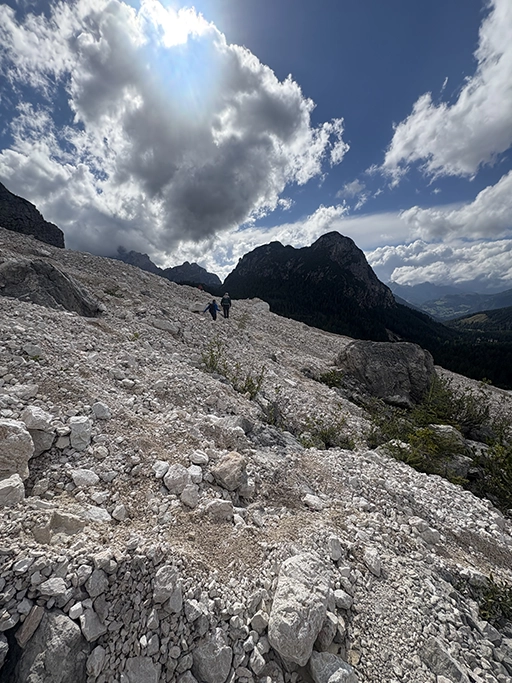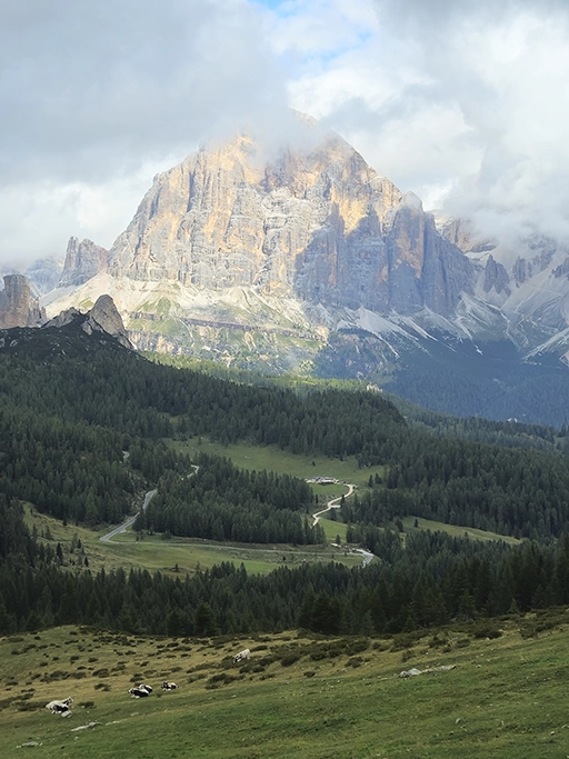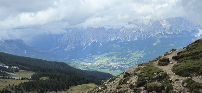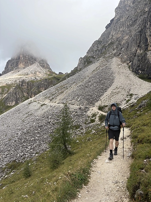 We met a group of 5 American guys who were playing Eye of the Tiger on a stereo, and that helped me up a couple of hills. Generally I think it’s poor trail etiquette to play music out loud, but I made an exception this time. They kindly took a picture of us at a strategic viewpoint. After a while we could see Cortina di Ampezzo in the distance and the guys turned in that direction – this was their last day on the trail. We pressed on to conqer more passes and soak in more views.