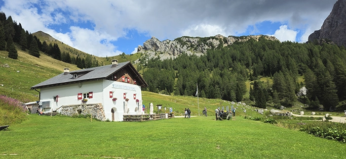We found a bit of shelter on the side of an old barn to eat our lunch, which we had purchased at Averau that morning. From there it was an easy walk down a gravel road to Rifugio Citta di Fiume, where we rested and bought drinks at about 4pm.