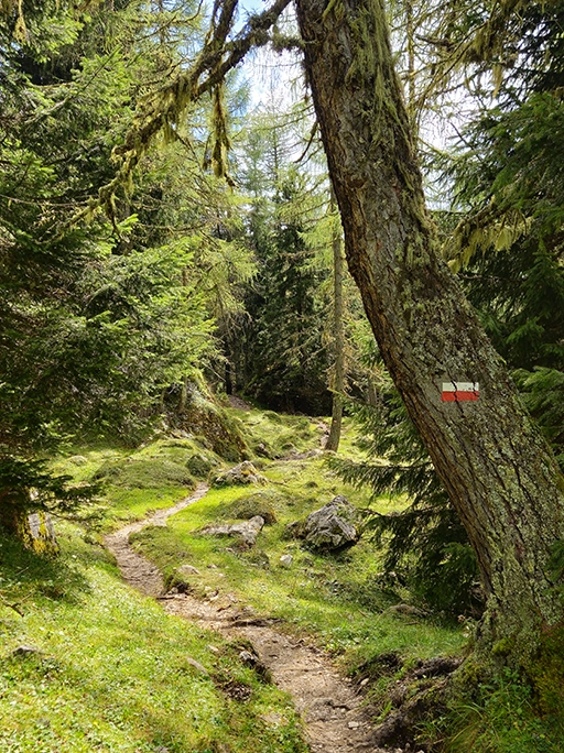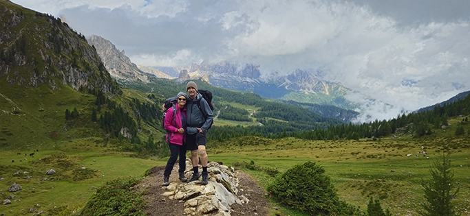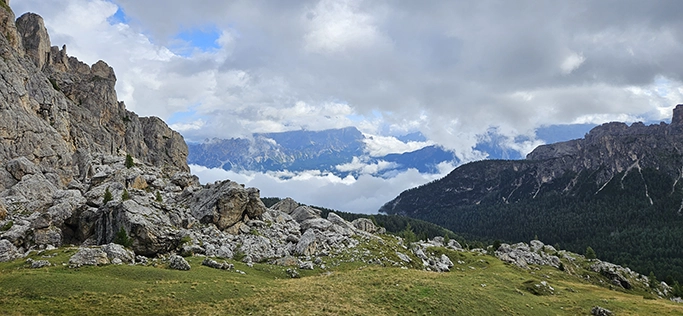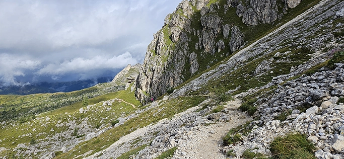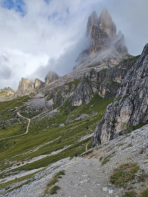 Even though the day was more downhill than up, there were a few smallish mountain passes to conquer. It was a steep walk down with Rifugio Averau getting smaller in the distance behind us, then a rambling walk along a gravel road. We missed the turn off as we were bouncing joyfully down the road, but Steve’s Garmin beeped to let us know, so we turned back and found the trail.
