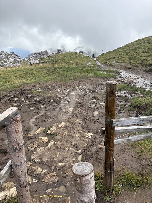 After the forcellas were done, the descent began and so did the muddy tracks (picture 9). Steve slipped down a muddy incline and got mud all over his legs and shorts. I slipped when stepping down from a rock and my foot just went out from under me. My shoulder took the brunt of the fall instead of my bum-bum, because I reflexively gripped my hiking pole and twisted my arm socket. No injury, fortunately.