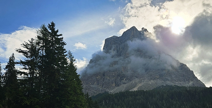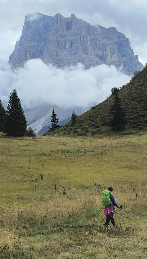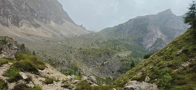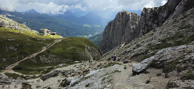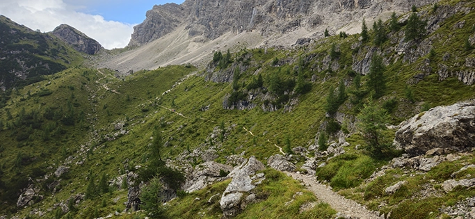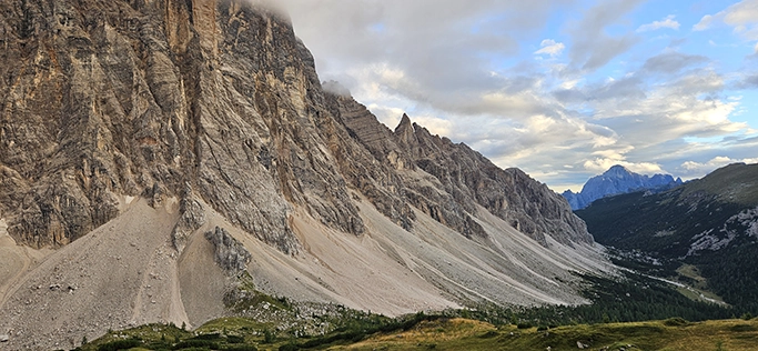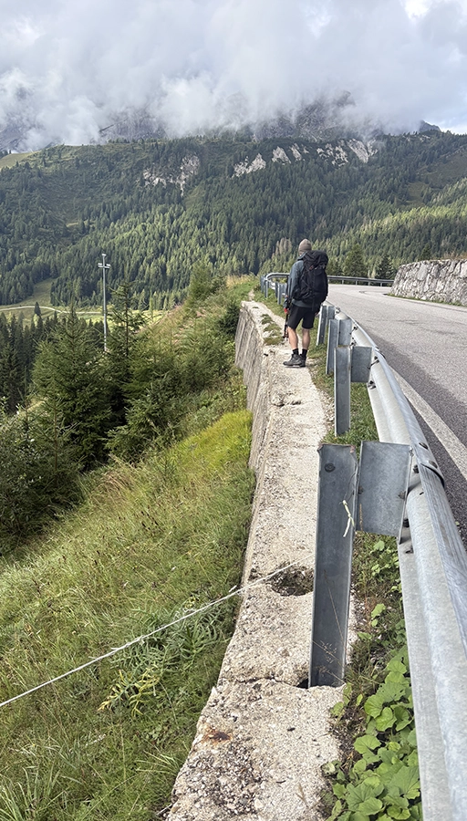 Although Passo Staulanza was at a relatively lower altitude, we still saw great views looking up to Monte Pelmo when we departed in the morning. The first part of the walk today was along a roadside, including a very odd ledge that required careful navigating but made a nice change from gravel and rocks. After an easy couple of km, we had our first upward climb which opened out to fields with great views at the top.