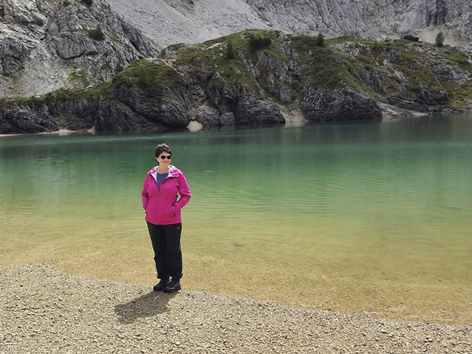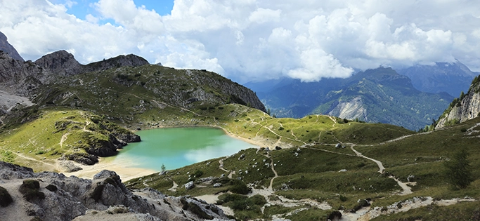 Fortified, we continued up Forcella Coldai with the rifugio getting smaller behind us. After topping the pass, Lago di Coldai appeared, which marked the beginning of a long descent. We stopped to admire the lake for a while, and a couple of enthusiastic hikers braved the icy water for a swim.