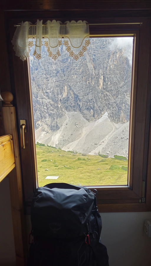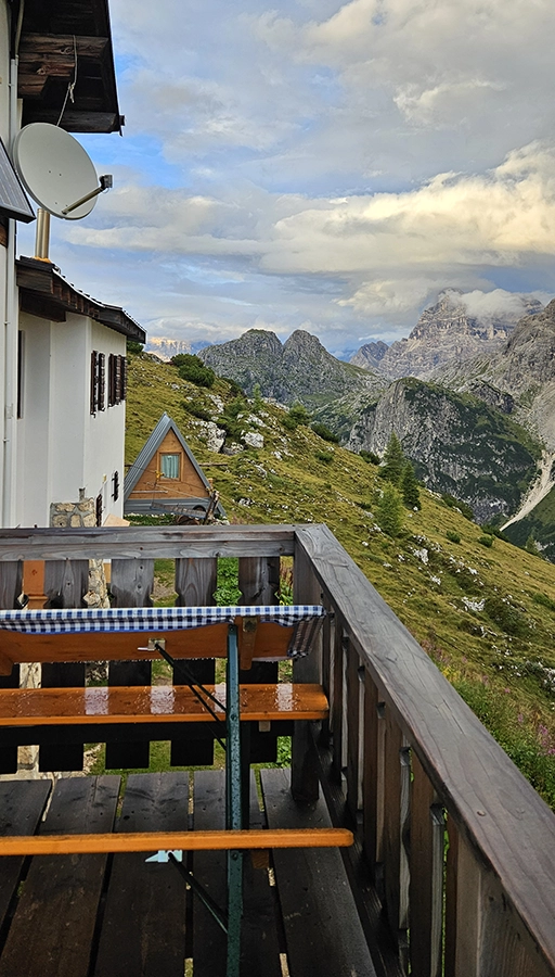 The climb up to Rifugio Tissi is a tough one. I was slow, while Steve went on ahead. Being slow can be rewarding: a spectacular full rainbow appeared, and Steve missed it. The walk up is worth it, as Rifugio Tissi has some of the most amazing views due to its location perched on the mountainside. Being difficult to get to also means this rifugio has to carefully manage its resources such as water.