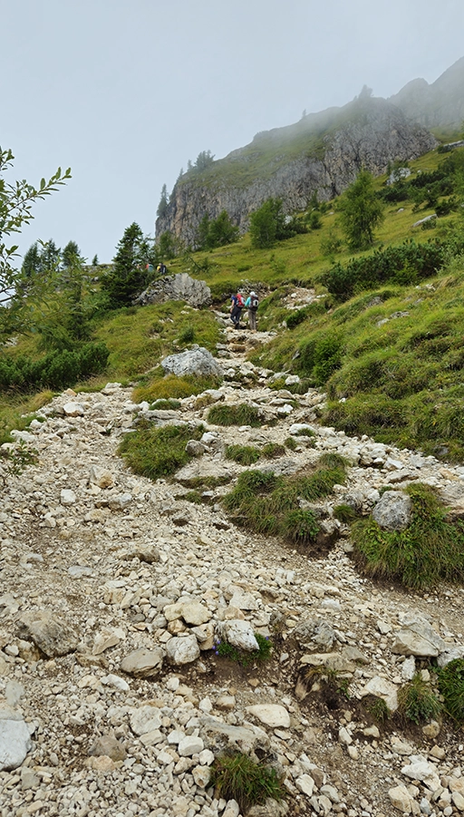 After a short time we started the ascent up to Rifugio Coldai where we planned to have lunch. I needed the loo but there was no where to go, no places to hide and the track was quite busy with hikers, so I hung on until lunch – one of the challenges of being a female on the AV1. We were wearing our rain gear again today, although the rain was intermittent and wasn’t heavy. The upward path was a light stream in places, and I found it easier to walk in the streams, because the water washed the mud away and it was less slippery.