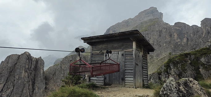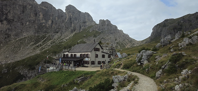 Near the top we passed a pulley system that the rifugio used to bring up goods, then Rifugio Coldai came into eyeshot. There were a lot of hikers milling about, having beers and enjoying the views. It was warm inside and I decided, for my efforts, it was OK to have apple strudel and hot chocolate for lunch.