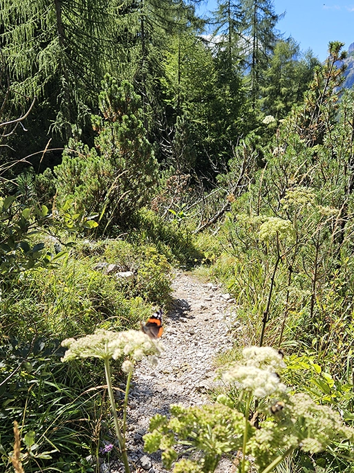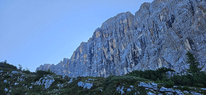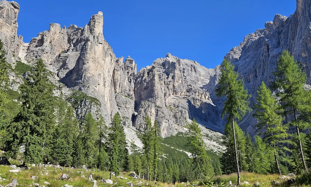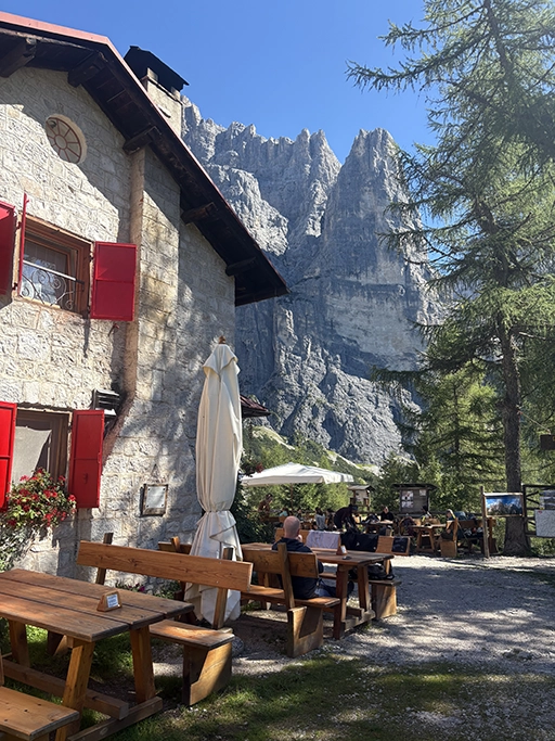 After a relatively easy undulating walk we reached Rifugio Vazzoler for a very early lunch. We shed some layers and soaked up the sun for a bit. Then there was a delightful wide easy track for a while with some awesome views of the tall rocky peaks.